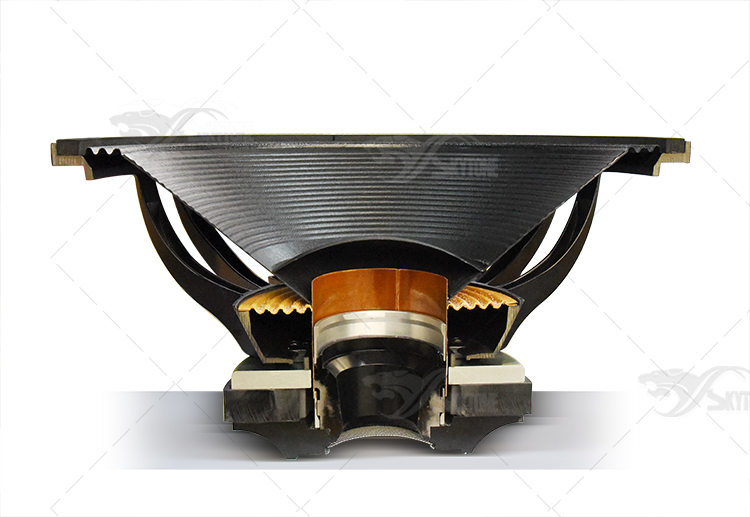 我们最常见的电动式锥形纸盆扬声器。电动式锥形扬声器即过去我们常说成纸盆扬声器,尽管2014年振膜仍以纸盆为主,但同时出现了许多高分子材料振膜、金属振膜,用锥形扬声器称呼就名符其实了。锥形纸盆扬声器大体由磁回路系统(永磁体、芯柱、导磁板)、振动系统(纸盆、音圈)和支撑辅助系统(定心支片、盆架、垫边)等三大部分构成。
